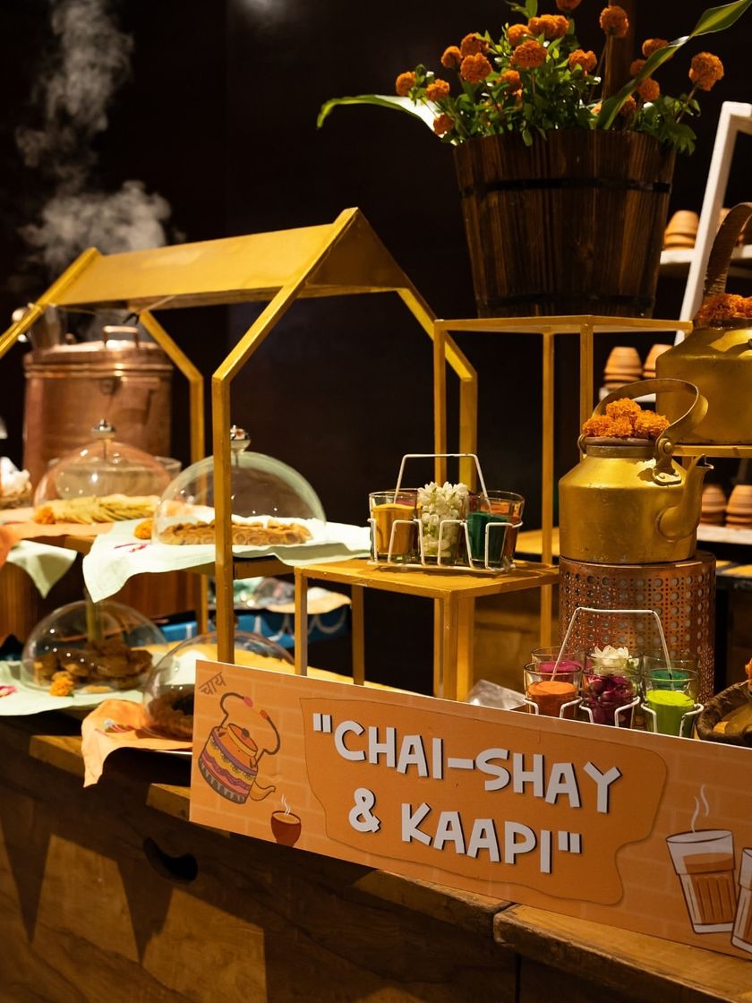 We curate beverage experiences to suit any time of day. This includes refreshing welcome drinks and mocktails like our Mango Magic and Aam Panna, as well as elaborate 'Chai-Shay & Kaapi' high tea setups complete with cookies and traditional snacks.