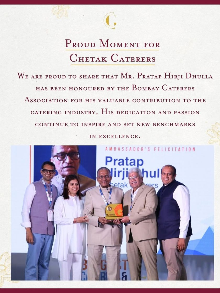 We are proud of our heritage and the trust our clients place in us. This is a collection of testimonials from happy clients and moments of recognition, like the honour bestowed upon Mr. Pratap Hirji Dhulla by the Bombay Caterers Association.