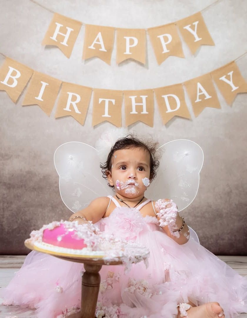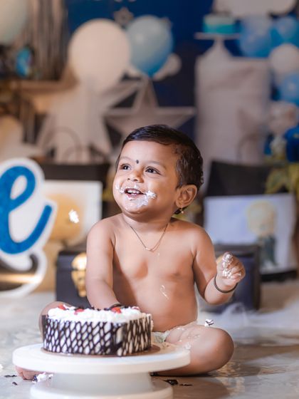 Let's make a mess! My cake smash sessions are all about capturing the hilarious, messy, and joyful moments as your child explores their first birthday cake. I provide the setup with banners and props, you just bring the baby and get ready for some pura masti (full fun).