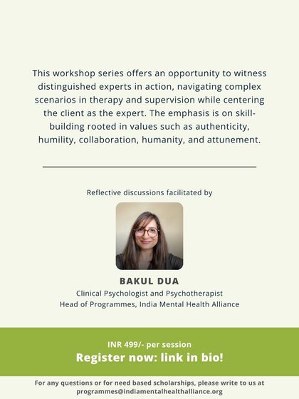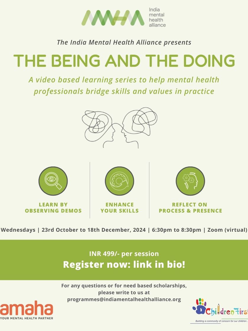 We partner with organizations like the India Mental Health Alliance (IMHA) to host "The Being and The Doing," a video-based series for professionals. These sessions feature expert practitioners demonstrating skills in psychotherapy and supervision, focusing on culturally resonant and values-based practice.