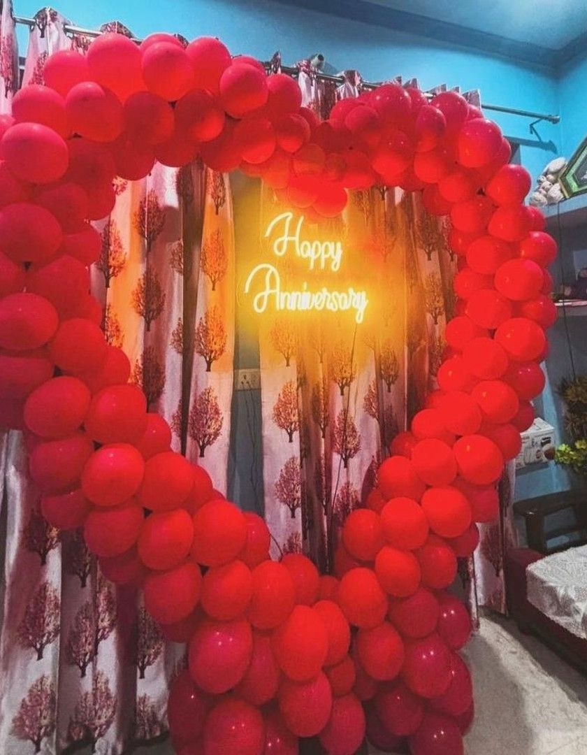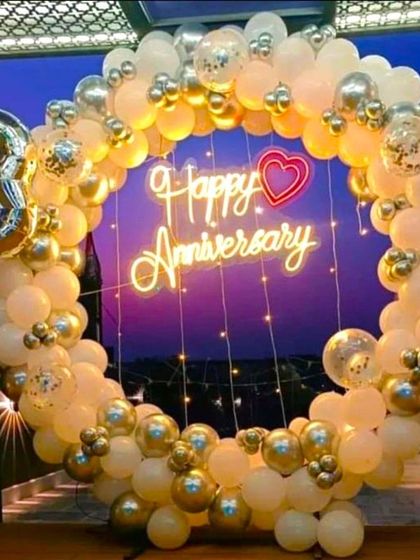 I create memorable decorations for wedding anniversaries, whether it's your 1st, 25th, or 50th. I offer custom setups including romantic heart-shaped balloon frames, elegant balloon rings with neon signs, and large marquee numbers to highlight your milestone.