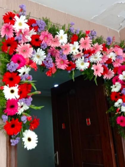 I create warm and welcoming entrances for your new home or any special event. I specialize in traditional Indian housewarming (Griha Pravesh) decorations, using fresh flower garlands of marigolds, roses, and jasmine to adorn main doors and entryways across Bangalore.