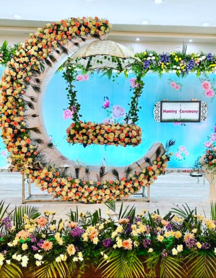 I provide decorations for all your baby's milestone events in Bangalore. This includes modern balloon setups for baby showers and baby welcome parties, as well as traditional flower decorations for Seemantham, Naming Ceremonies (Thottil Funj), and Mundan ceremonies.
