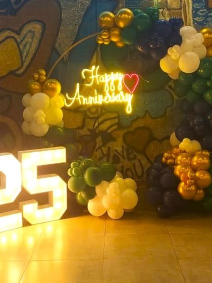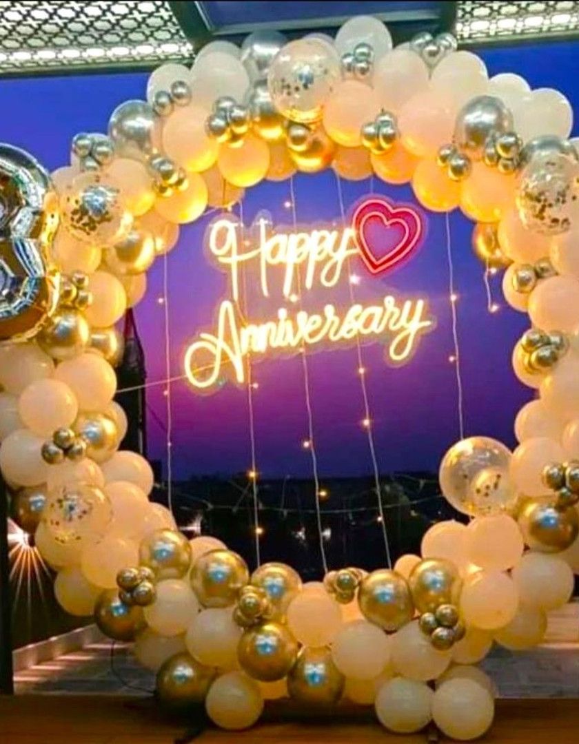 I create beautiful backdrops for anniversaries, engagements, and other romantic occasions. Setups often include balloon arrangements in heart shapes or rings, custom neon signs, and light-up marquee numbers to mark the milestone year.