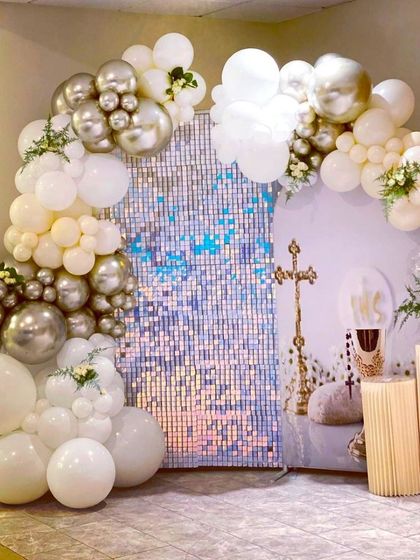 I provide elegant and respectful decoration services for religious milestones like First Holy Communion and Baptisms. I can create beautiful photo backdrops using shimmer walls, balloon arches, and custom props to suit the solemnity of the occasion.