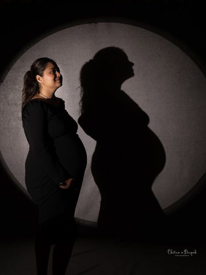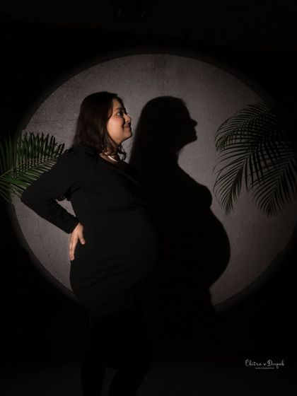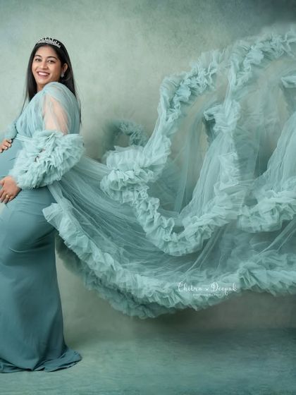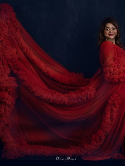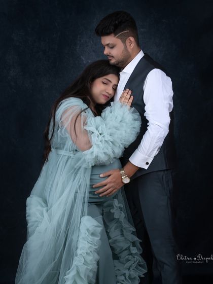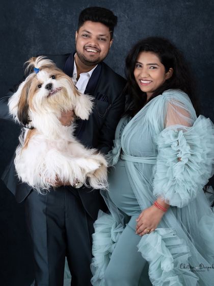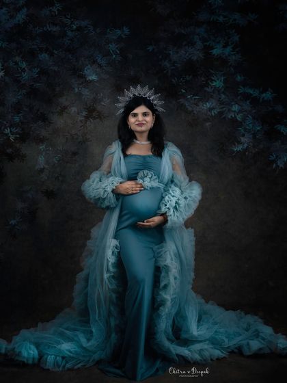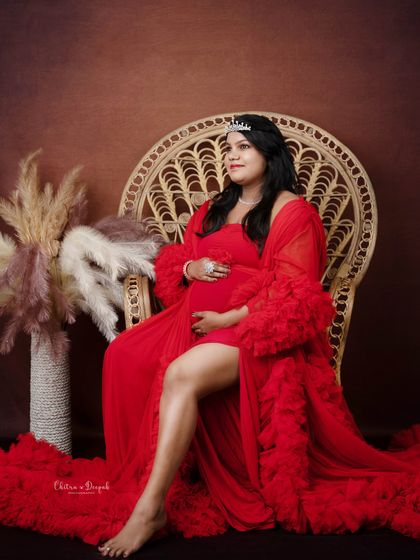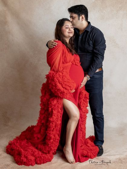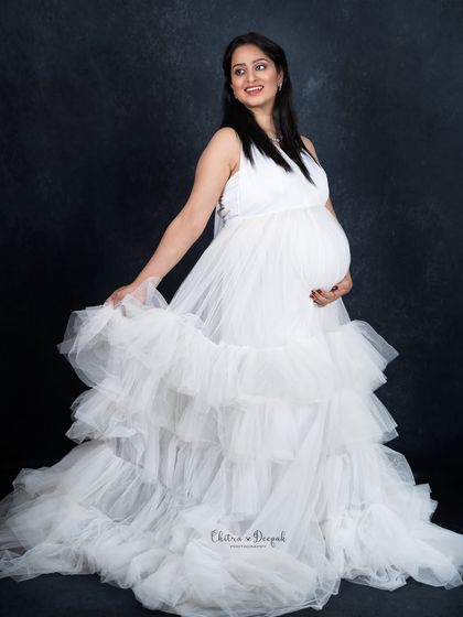I do maternity shoots in my Bangalore studio where you can pick your style, wear our gowns or your own, and bring your family and pets for relaxed, custom portraits.