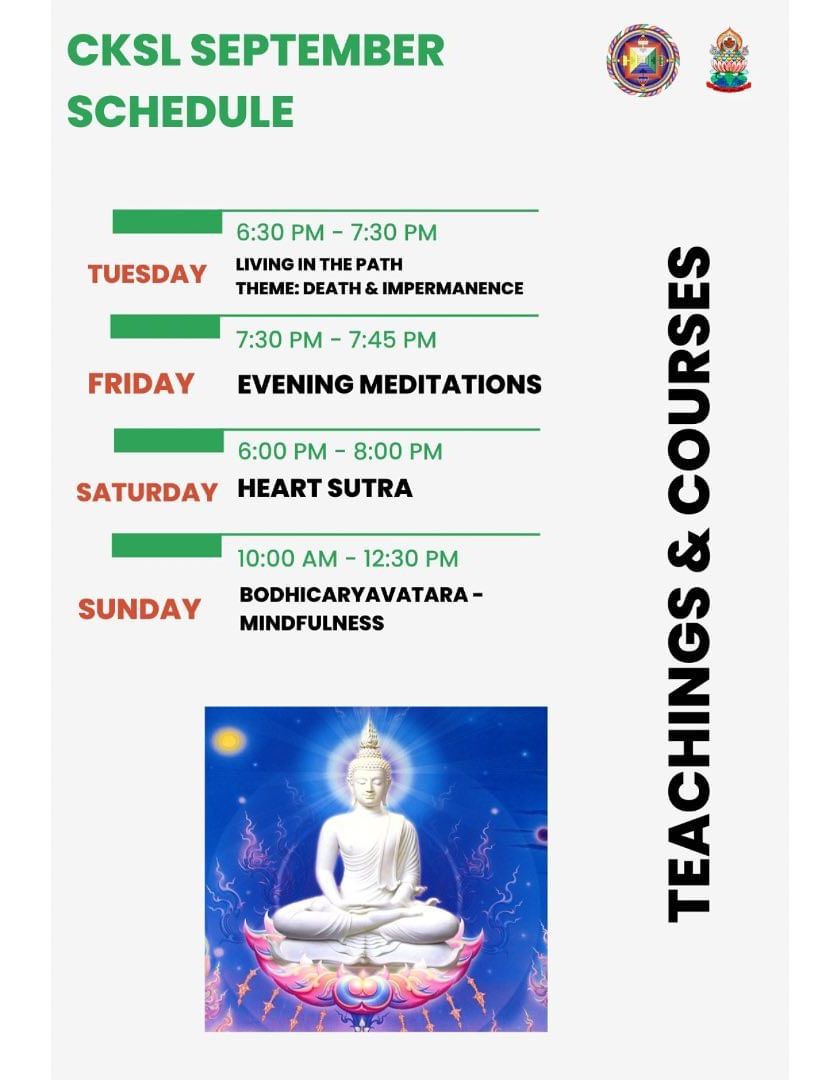 We offer regular guided meditation sessions suitable for all levels. Join our short online evening meditations to unwind, or participate in specific practices like Medicine Buddha for healing, Tonglen for compassion, and student-led group discussions to strengthen your practice.