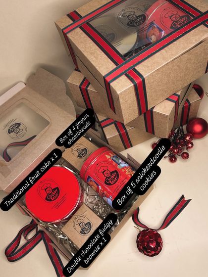 I offer a full range of Christmas goodies perfect for gifting or your own celebration table. The menu includes traditional plum cakes in gift-ready tins, a show-stopping Christmas tree-shaped cake, and the Ultimate Christmas Hamper packed with shortbreads, brownies, and cookies.