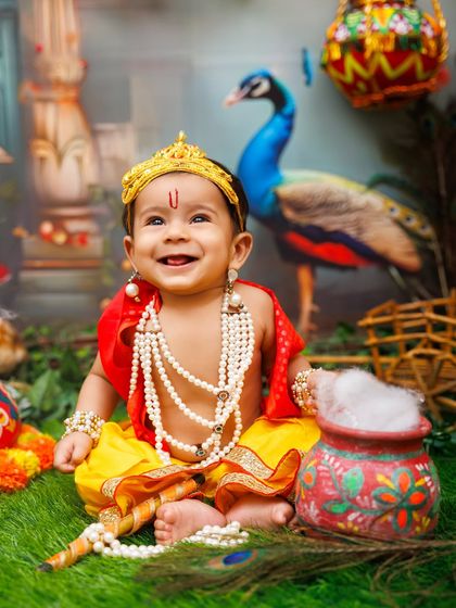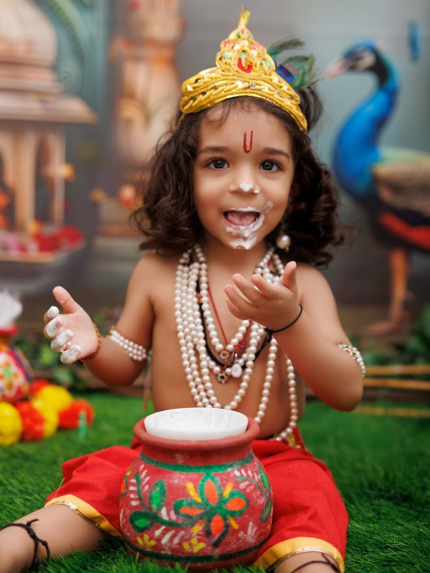 I absolutely love celebrating Janmashtami by transforming little ones into the most adorable natkhat Kanhas and lovely Radhas. These mini sessions are filled with vibrant colors, traditional props like makhan handis and flutes, and capture the playful spirit of the festival.