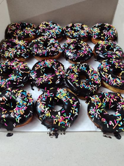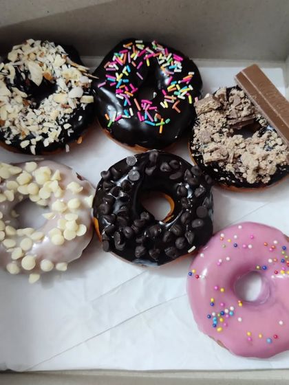 My homemade donuts are perfect for gifting or as a party treat. I offer a wide range of toppings, including chocolate glaze with sprinkles, crunchy almonds, KitKat crumble, and various chocolate chips.