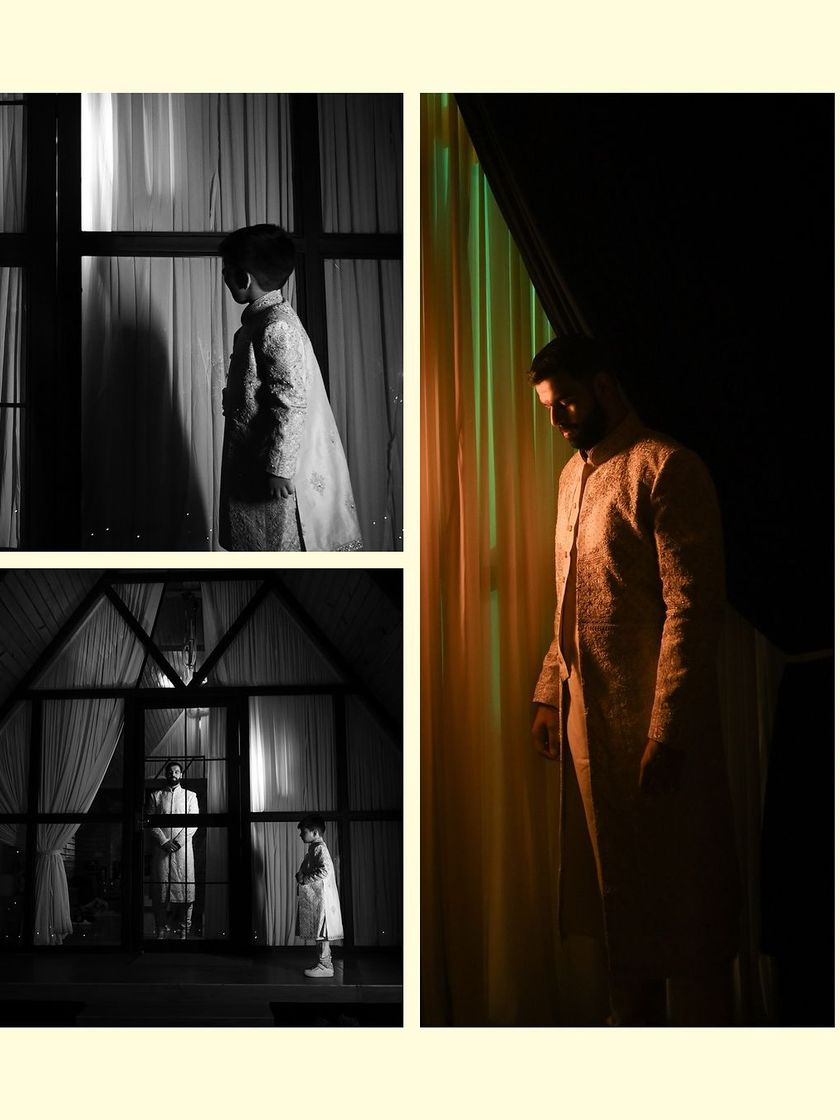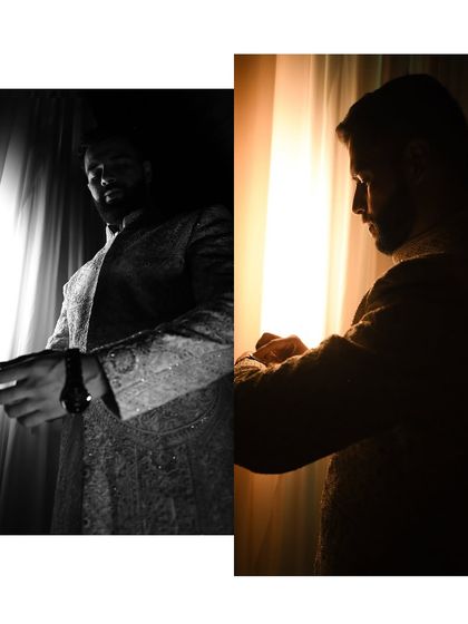 The groom's story is just as important. I create stylish and dramatic portraits that capture the groom's personality, from the final moments of getting ready to his confident entrance. These shots are all about celebrating his style and anticipation.