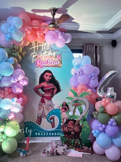 Bring your child's favorite characters to life. We create fully immersive party environments for themes like the Avengers, Moana, Peppa Pig, Tom & Jerry, Frozen, and even sports themes like RCB, complete with custom backdrops and props.