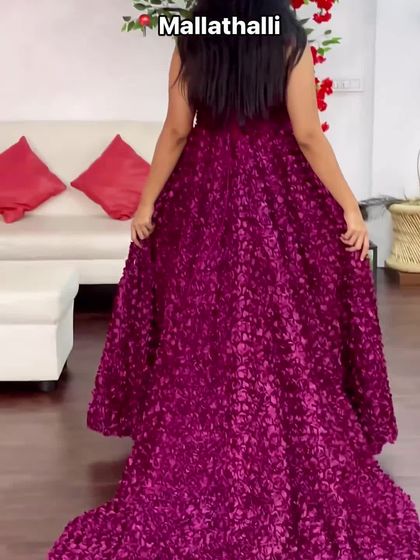 - Styles: Selection includes long tail gowns (3+ meter fabric trail), ruffled net gowns, and satin flowy designs.
