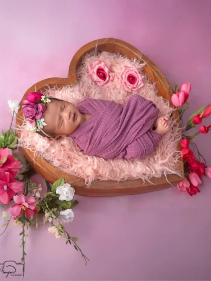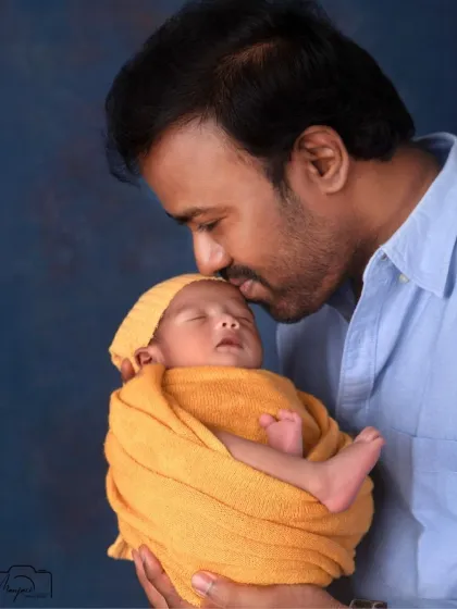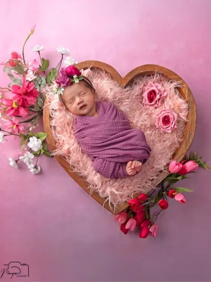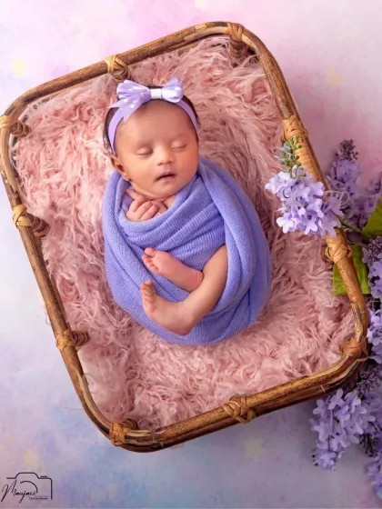 I do newborn photo sessions in my Whitefield studio with natural setups, props, and family portraits, focusing on relaxed and detailed shots of your baby’s early days.