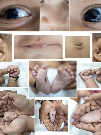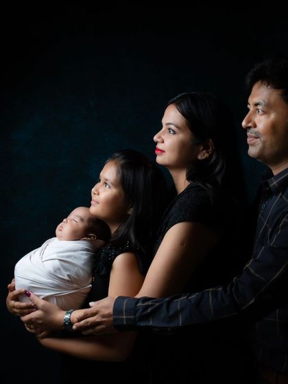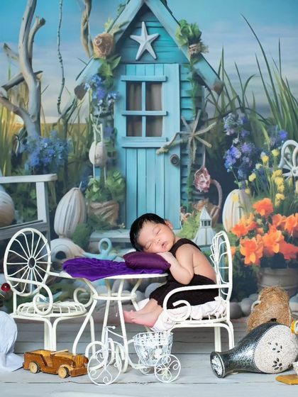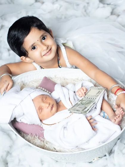 We do baby photoshoots with creative props, local Bangalore themes, and family participation, either at your home or our studio, focusing on your baby's personality and comfort.