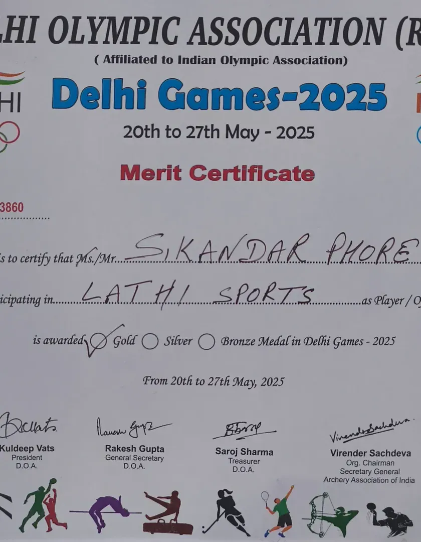 I am not just a coach. I am a Delhi Games Lathi gold medalist, a national-level official, and a 3rd Dan Black Belt. These documents show my official appointments and certifications in the world of martial arts.