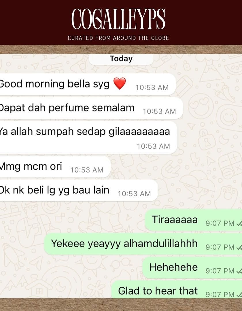 Don't just take my word for it. See what others are saying about how my inspired perfumes smell just like the original, last for days, and are worth every ringgit. These are real messages from happy repeat customers.