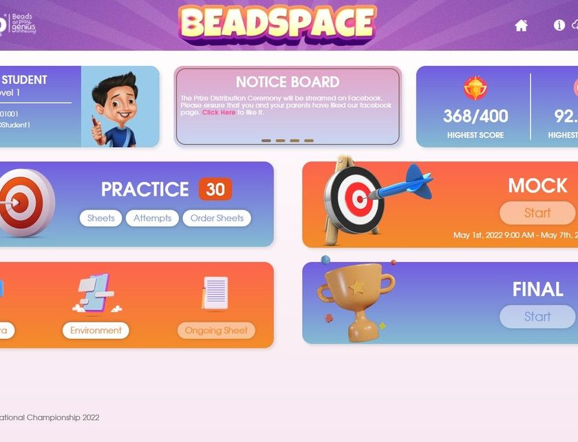 To support our students everywhere, we developed BEADSPACE, our exclusive online platform. It is a comprehensive tool for students to practice sums, take mock tests that simulate the championship environment, and track their accuracy and speed. It's the perfect companion to our classroom sessions.