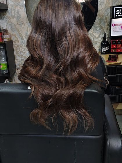 - Consultation: Assessment of hair porosity and selection of single-tone shades (Chocolates, Mochas, Burgundies, or Blacks).