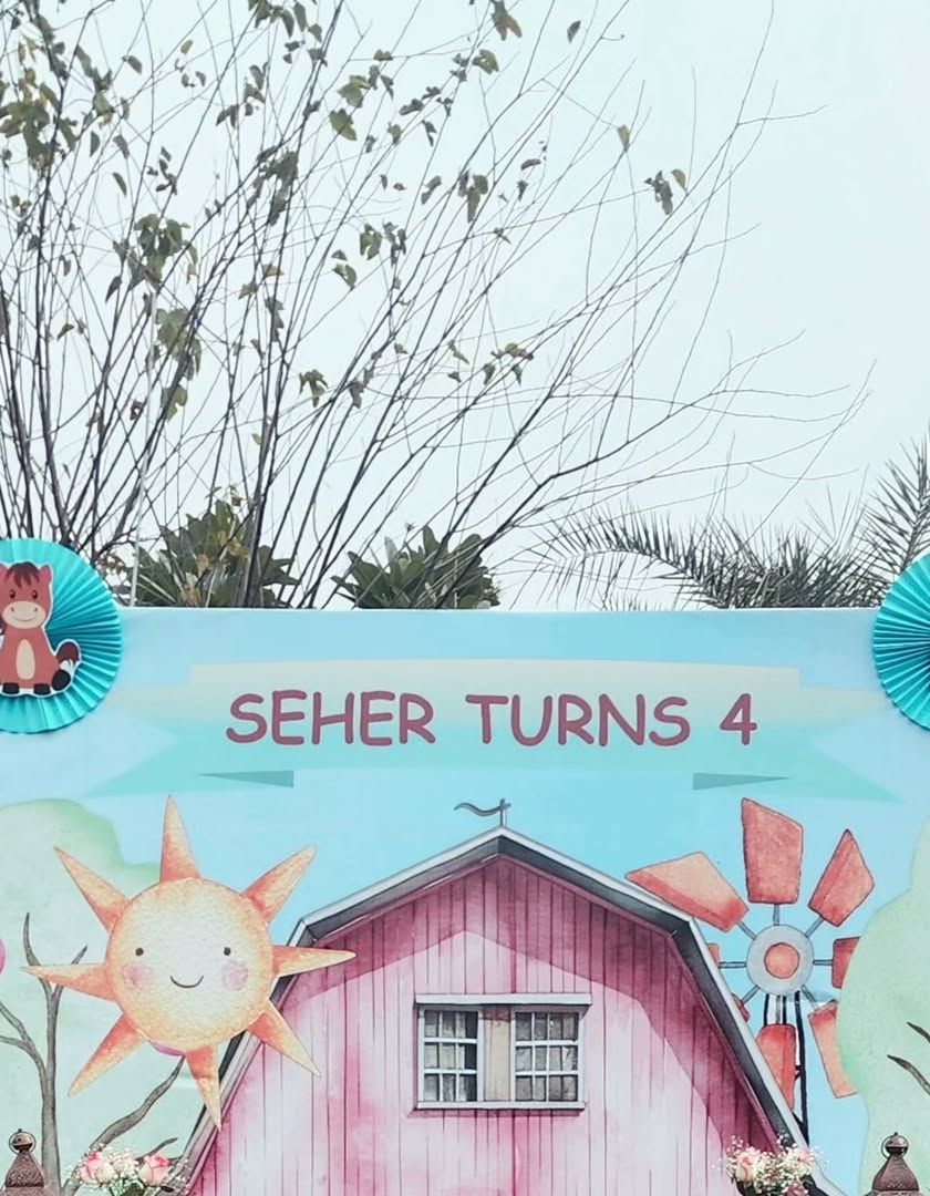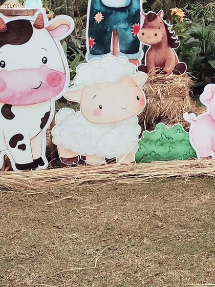 I create a delightful barnyard setting for a farm-themed party, perfect for outdoor celebrations. The decor includes a big red barn backdrop, adorable cutouts of farm animals like cows and sheep, hay bales, and themed welcome signs.