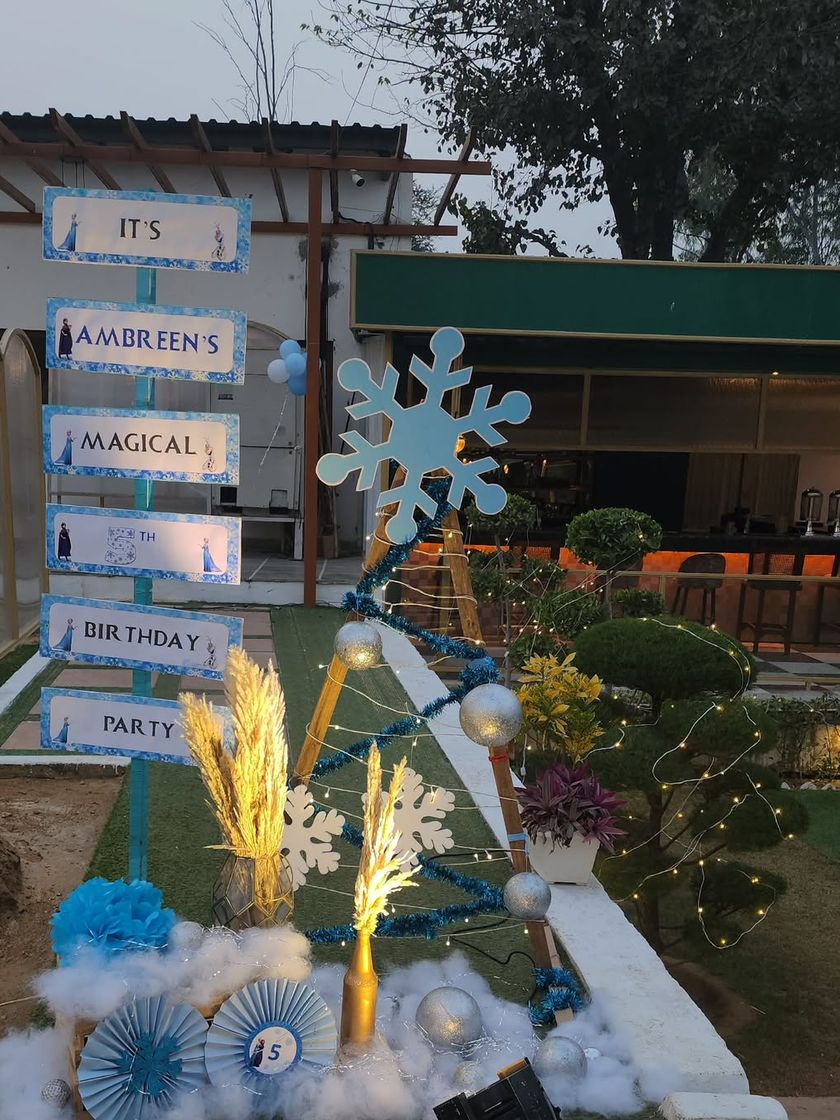 I bring the magic of Arendelle to life with a Frozen-themed winter wonderland. The setup includes shimmering silver backdrops, castle entrance arches, snowflake details, and character cutouts of Elsa, Anna, and Olaf, complete with fun activities like a toy train and a polar bear mascot.