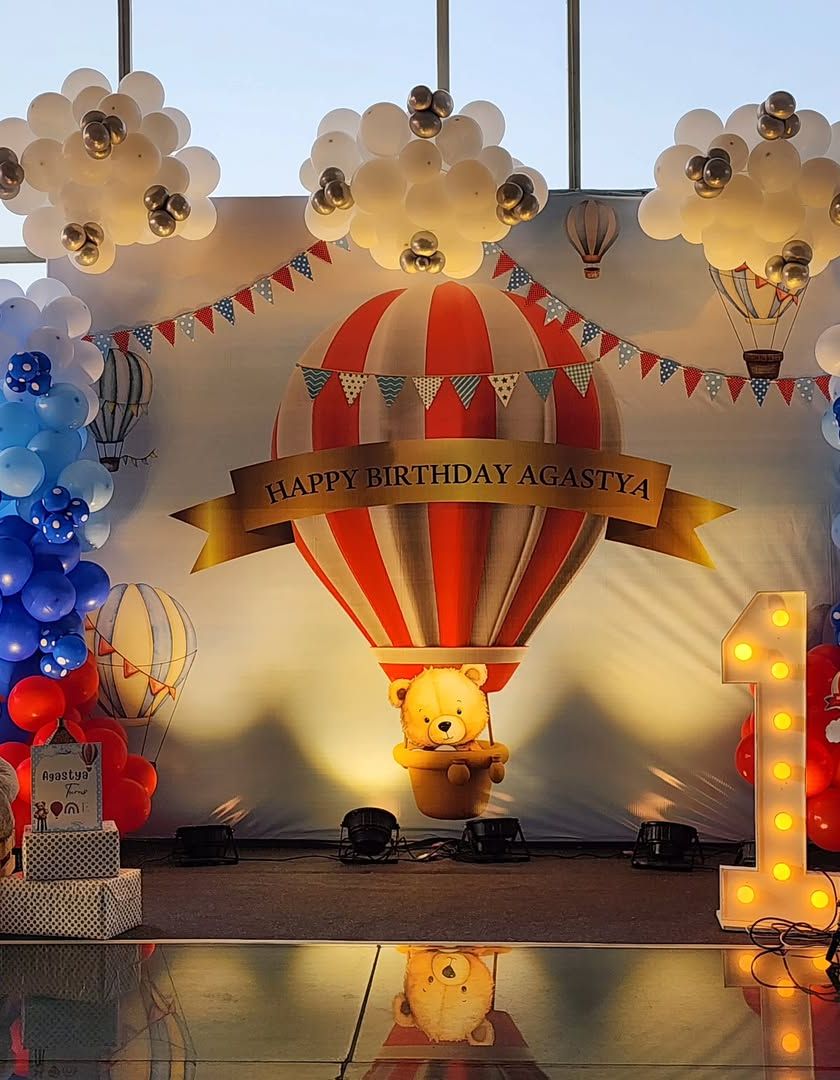 Perfect for a first birthday, the "Up, Up, and Away" theme is full of wonder. I design custom backdrops with 3D hot air balloons, cloud-like balloon clusters, and themed table centerpieces featuring teddy bears and personalized signage.