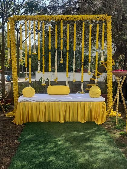 - For Mehendi & Haldi, I go all out with marigold flower decor, lots of genda phool, and cozy, happy colors. Sometimes I add quirky frames or floral signs for that extra touch.