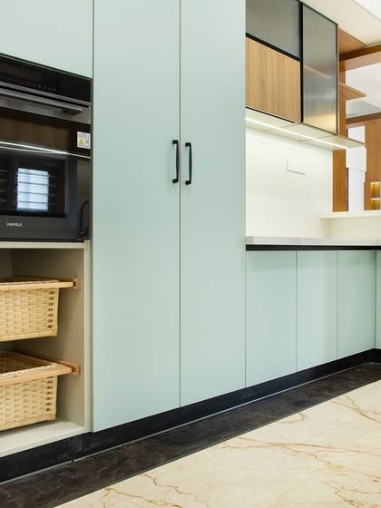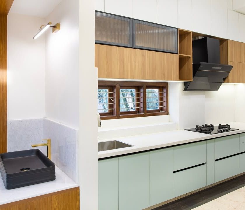This design brings the calmness of nature indoors with soft sage green cabinetry paired with natural wood tones. I created an open, airy feel with a breakfast counter and integrated storage, making it a functional and peaceful heart of the home.
