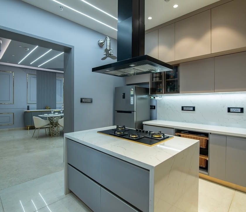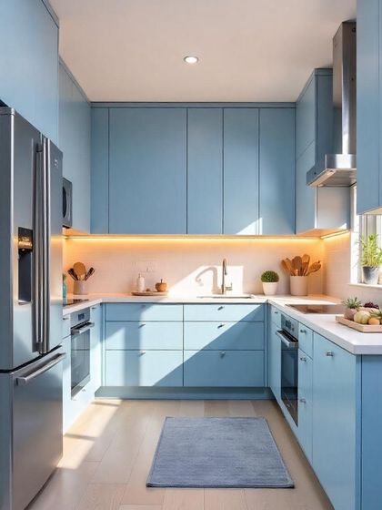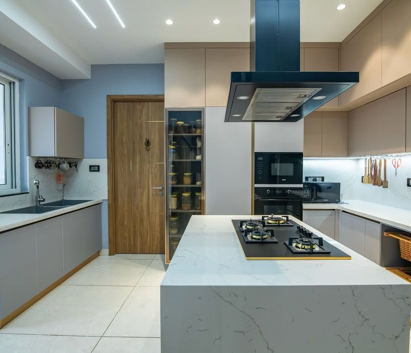 This kitchen is designed around a central island, creating a hub for cooking and conversation. I focused on a tranquil palette of soft blue-gray and warm beige, using handleless cabinets and a veined quartz countertop to create a space that feels both modern and serene.