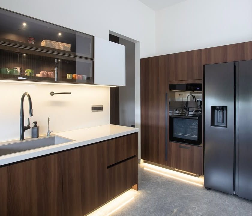 Here, I balanced the richness of dark walnut cabinetry with crisp white upper cabinets and countertops. The U-shaped layout maximizes efficiency, while under-cabinet and kick-plate lighting adds a warm, inviting glow perfect for any time of day.