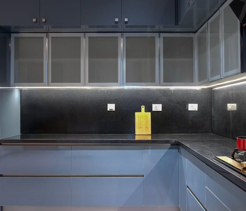For clients who love a dramatic and contemporary look, this kitchen makes a statement with high-gloss blue cabinetry and a striking black granite countertop and backsplash. The frosted glass upper cabinets and integrated lighting keep the space from feeling heavy, proving that dark colors can feel expansive and chic.