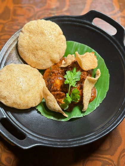 - Goan Prawn Balchao, spicy and tangy, with soft Poi bread