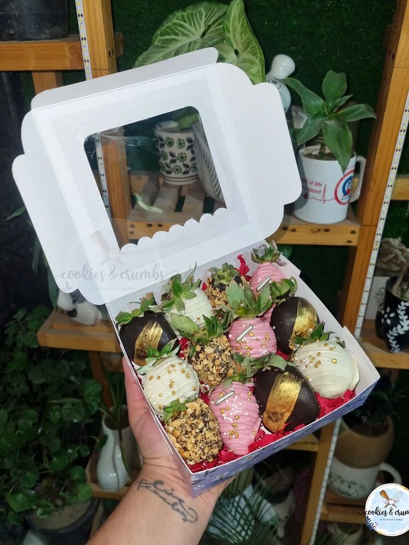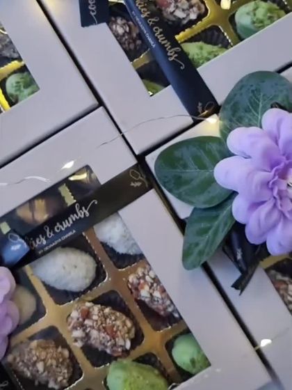 I create custom gift hampers for every festival and special occasion, with options available for all budgets. These boxes are filled with a mix of my signature treats like brownie bites, stuffed dates, tea cakes, and cookies, all beautifully packaged and ready for gifting.