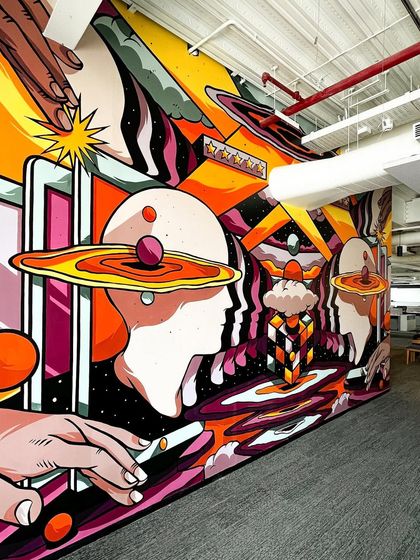 I take my illustrations from the screen to the wall, creating large-scale murals for offices and events. I handle the entire process, from conceptual design to managing the on-site painting and installation. These projects transform spaces into immersive, branded environments, as seen in my work for the Rippling offices in Bangalore.