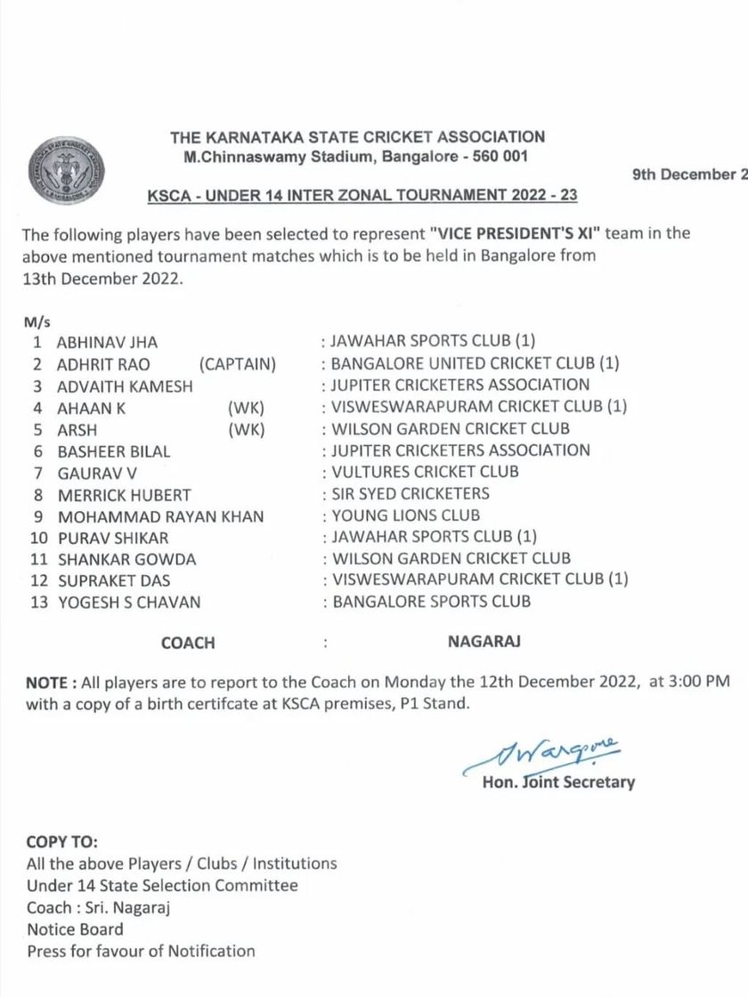 We provide a clear pathway for talented players to get noticed. Our structured training and competitive match exposure have helped numerous academy players get selected for official KSCA zonal and state-level teams, as shown by these official selection notices.