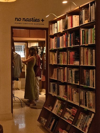 Our space is full of handpicked brands - each with its own story. Downstairs, Love Me Twice Thrift is a real treasure hunt, full of pre-loved sarees, funky shoes, books and more. No Nasties sits in another nook, offering sustainable fashion finds made from 100% organic cotton. And for book lovers, Champaca Bookstore brings thoughtful reads you can flip through with your coffee.