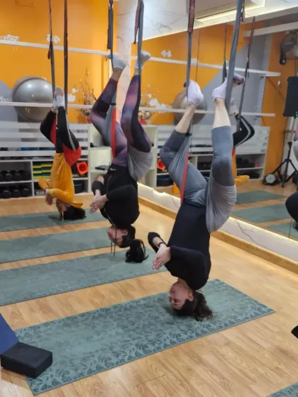We teach aerial yoga using hammocks for full-body workouts, deep stretches, and spinal decompression, with beginner-friendly group, flow, partner, and kids sessions.