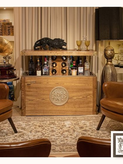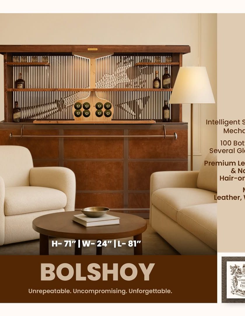 These are not just bars; they are grand centerpieces for your room. Disguised as elegant consoles, they reveal a full-service bar with automated lifts, ample storage, and exquisite finishes in leather, hair-on-hide, and solid wood.