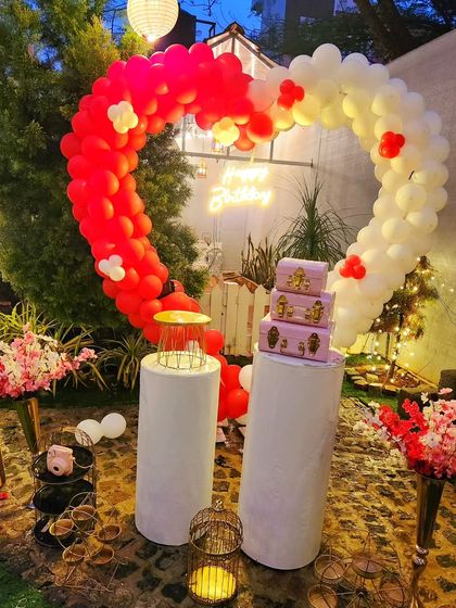 - Romance in the air? A romantic anniversary balloon arch, soft lights, and petals set the mood.