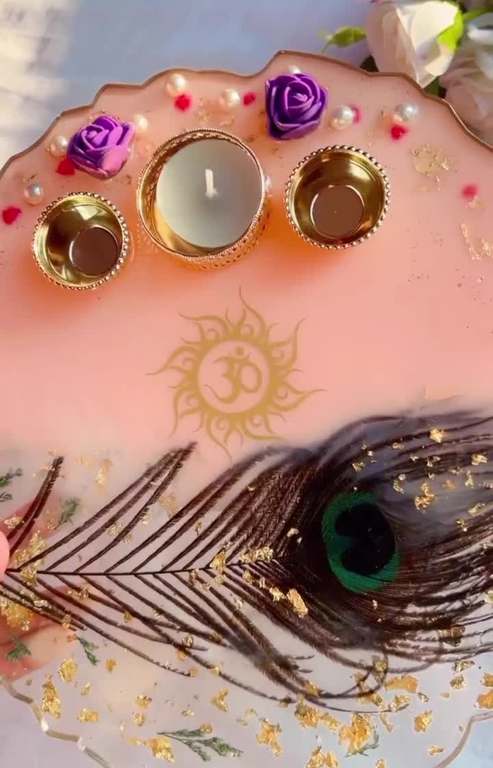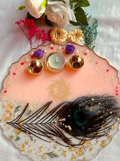 Bring a touch of handmade devotion to your puja corner with these custom resin thalis. I often incorporate sacred elements like peacock feathers or the Om symbol, and each set includes small bowls for kumkum and rice.