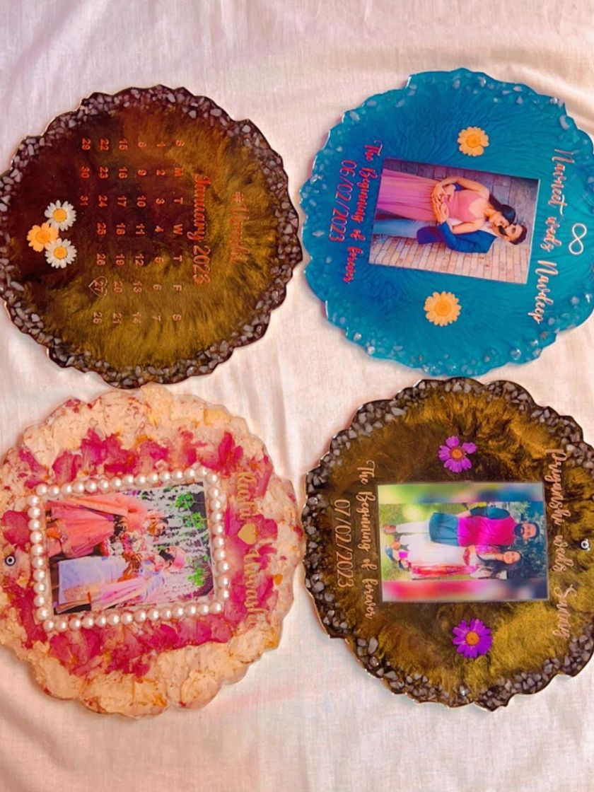 These resin platters are a beautiful way to display your cherished photos or mark a special date forever. I offer various styles, from vibrant colors and gold leaf accents to designs that incorporate calendars to celebrate anniversaries or birthdays.