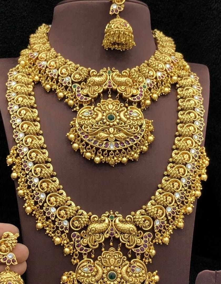 Discover our collection of South Indian temple jewellery and antique-finish sets. These pieces feature intricate carvings, goddess motifs, and a matte gold look, perfect for traditional ceremonies and a classic bridal aesthetic.