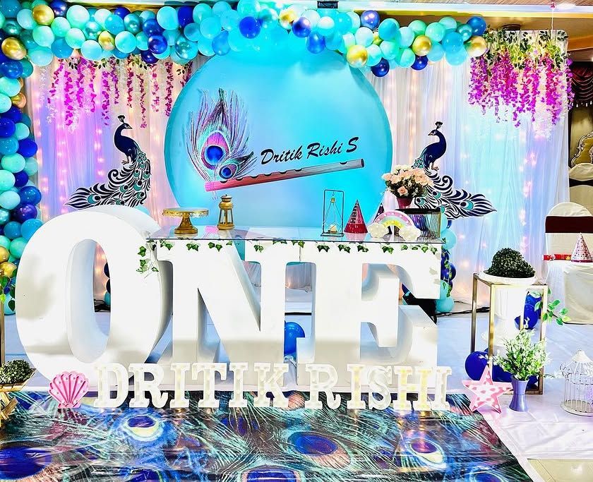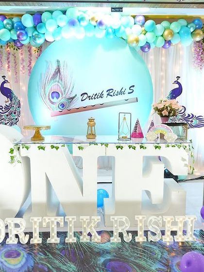 I specialize in creating unforgettable 'ONE' setups for your baby's first birthday photoshoot. From custom themes like this Krishna-inspired design to any idea you have, I build the entire scene with elements like large 3D letters, printed backdrops, and matching floor mats.