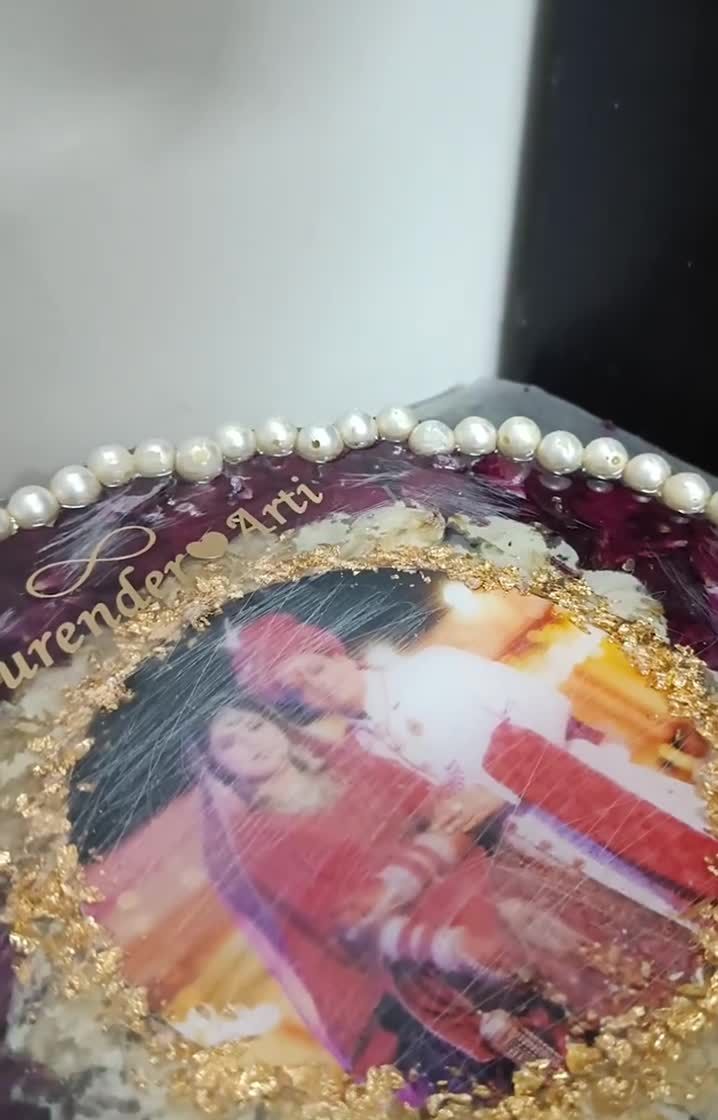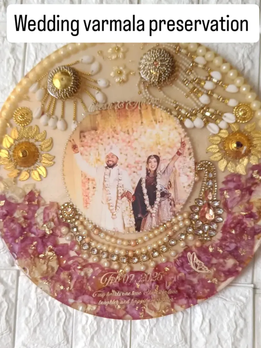 Your wedding day is full of items that hold deep meaning, from your varmala to your bridal kaleere and chooda. I preserve these precious elements in custom resin frames with your photos and names, turning them into a beautiful piece of art for your home. I can create designs in various shapes like square, round, and rectangular, with different floral arrangements and layouts.