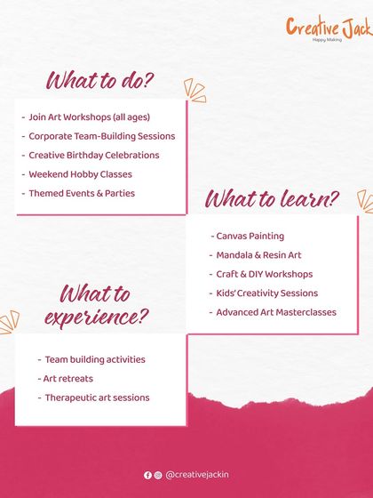 We’re Creative Jack - happy making is our jam. Art’s not about perfect lines here, it’s about messy hands, big laughs, and that spark when you try something new. Seen a group of grown-ups giggle over paint? Or a kid go wild with colors? That’s why we started. No pressure, just a space to play, connect, and leave stress at the door. Come as you are, leave a little lighter.