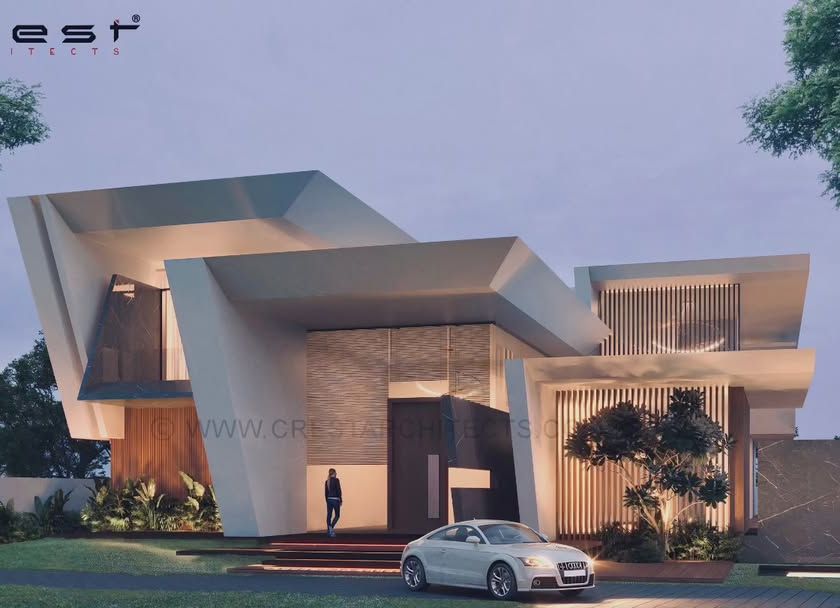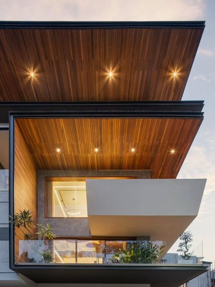 This project was a complete architectural intervention, transforming a conventional structure into a dynamic contemporary home. We wrapped the facade in timber and introduced bold, cantilevered balconies and refined interiors featuring rich marble, fluted teak, and sculptural ceiling forms to create a luxurious and functional urban residence.