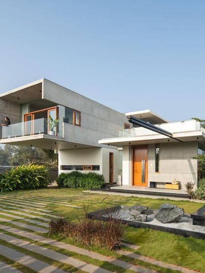 Inspired by the raw beauty of a quarry, this home is an exploration of sculptural forms, featuring an 18-foot cantilever and a unique gravity-defying staircase. We used exposed concrete and various types of stone to create a Vastu-compliant residence that feels both monumental and intimately connected to its tropical landscape, complete with serene water bodies.