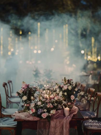No two wedding moments feel the same. We mix up the mood for each chapter - from a Haldi with purple tones and interactive flower stations, to outdoor mandap decoration combining pastel roses and traditional jasmine, and wedding tablescapes full of custom menus and floral centerpieces.