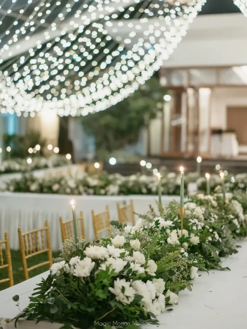 We believe a shared meal is a core part of the celebration, and the dining setup should be just as beautiful as the main stage. We design detailed tablescapes with elements like custom menus, floral runners, unique centerpieces, and personalized place settings.
