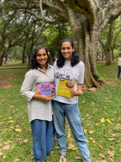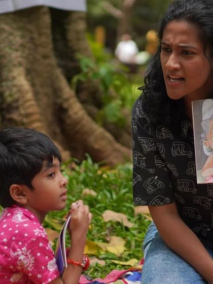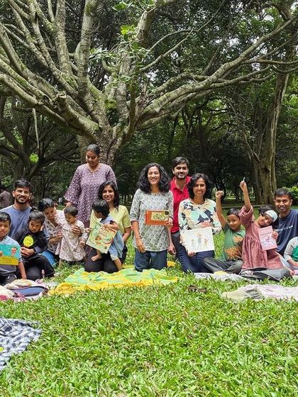 Every weekend, you’ll find us under the trees at Cubbon Park. I don’t just read - I act out characters, bring in songs, and there’s always some movement. Kids join in, roaring like lions, twirling scarves, or just rolling around in the grass. Sometimes chaos, always fun.
